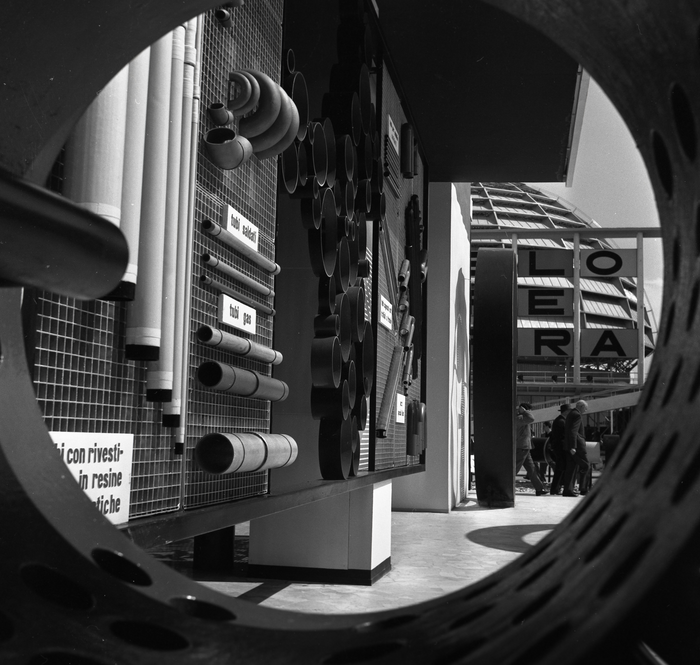 Esposizione all'aperto dei prodotti tubolari Dalmine alla Fiera Campionaria di Milano del 1957