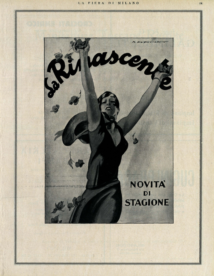 Riproduzione del manifesto pubblicitario de La Rinascente ad opera dell'illustratore Marcello Dudovich a pagina 61 della rivista La Fiera di Milano. Rassegna della Fiera Campionaria Internazionale di Milano. Anno II. Numero 3.