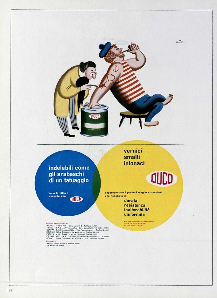 Illustrazione pubblicitaria curata dall'Ufficio pubblicità Montecatini per vernici, smalti, intonaci Duco. Slogan: Indelebili come gli arabeschi di un tatuaggio.