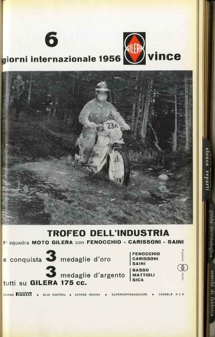 Slogan: 6 Giorni internazionale 1956 (logo Gilera) vince - trofeo dell'industria. La pubblicità è arricchita con una fotografia. Pubblicità a pagina 63 della Guida Ufficiale della XXXIV^ Esposizione Internazionale del Ciclo e Motociclo 1 - 10 Dicembre 1956 Milano.