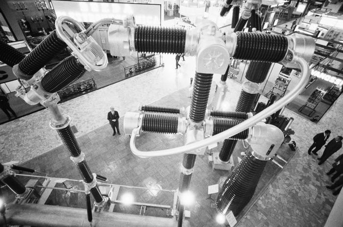 Interno del padiglione dell'elettronica ed elettrotecnica con visitatori. In esposizione un isolatore ceramico di grandi dimensioni per linee di alta tensione della Tecnomasio Italiano Brown Boveri, azienda specializzata in costruzioni elettromeccaniche ed elettrotecniche.
